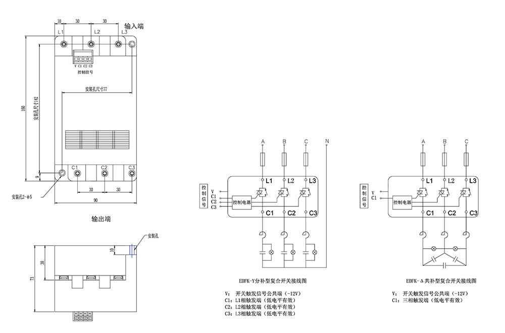 EDFK复合开关是由三个独立的复合开关组成的,适用于低压无功补偿电容组的通断控制。复合开关的基本工作原理是将可控硅与磁保持继电器并接。使复合开关在接通和断开的 瞬间具有可控硅过零投切的优点,而在正常接通期间又具有接触器开关无功耗的优点。